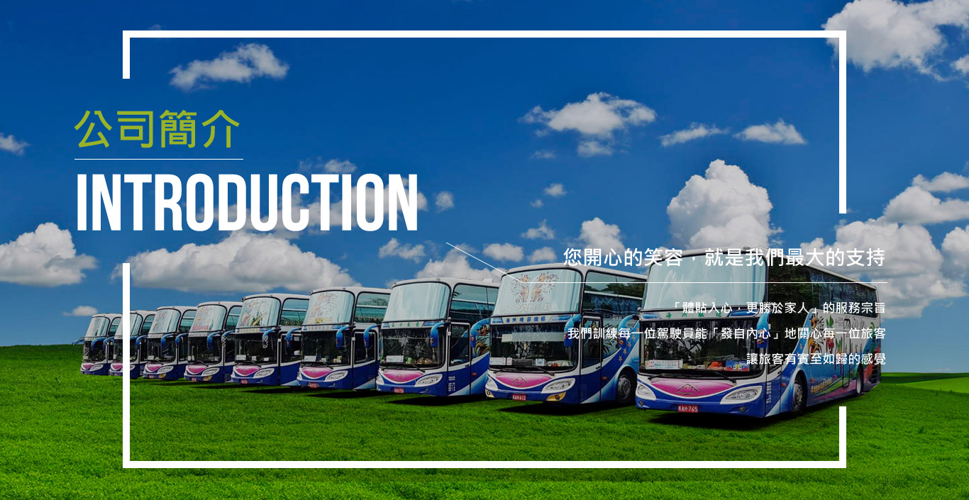 本公司長期經營大型遊覽車、中型遊覽車、小客車租賃之業務,積極且採多元化車種及服務,在穩定之中取得發展,進而從上市櫃公司上下班通勤車、學校上下課接駁校車,政府團體季節性接駁服務專車…等,公司秉持誠信服務、安全駕駛、正派經營、車輛管理、客戶至上、安全第一的營運理念,提供良好的服務品質,目前已轉型為專業運輸旅運管理公司。